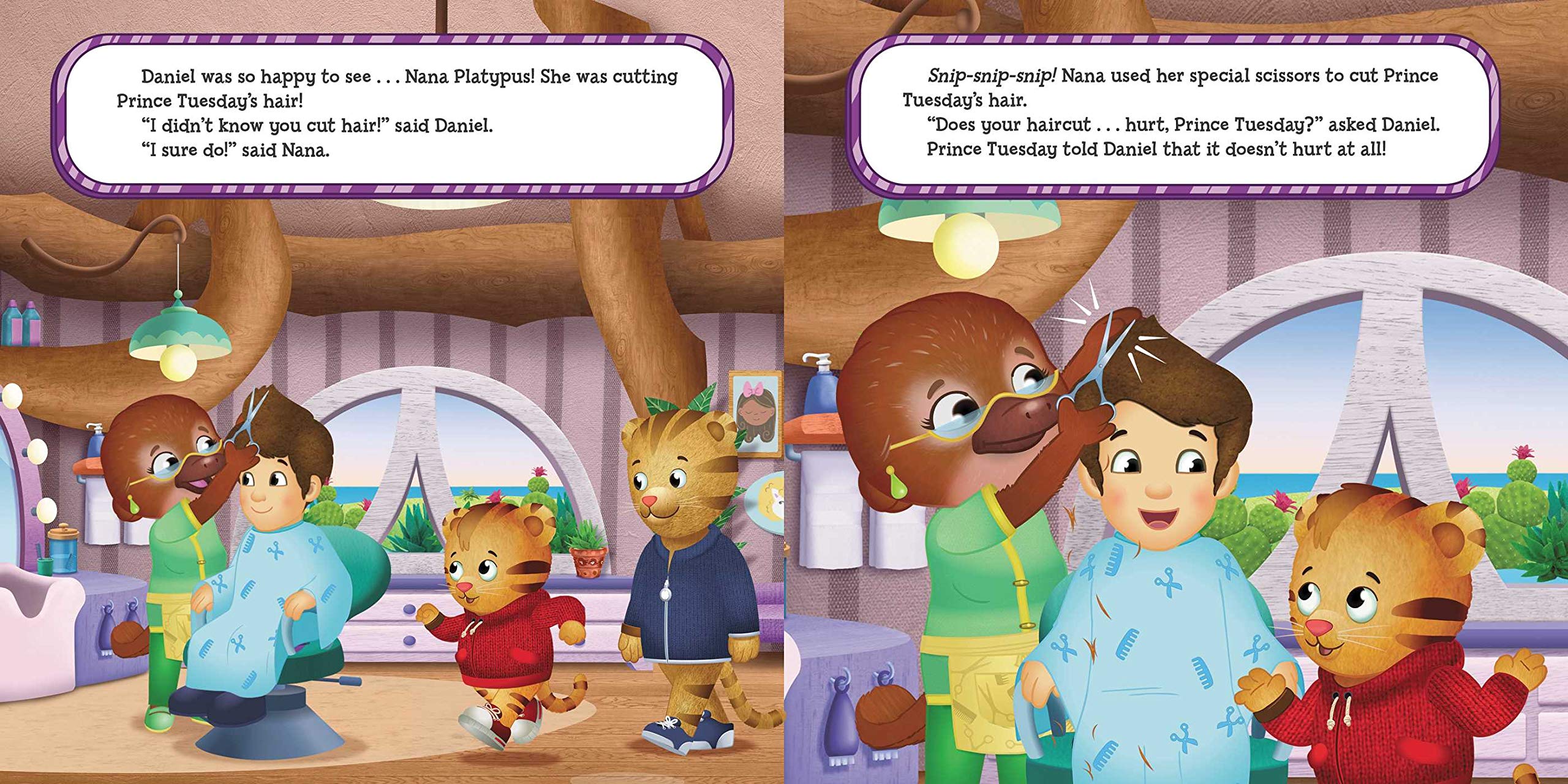 Daniel tiger gets a haircut. Daniel is using craft supplies to make a funny face when dad tiger notices that daniels hair has grown long enough that he needs a haircut. When daniel arrives next door for his haircut nana platypus is already cutting prince tuesdays hair. Daniels hair has grown a bit too long so dad tiger takes him to get his first haircut by nana platypus.