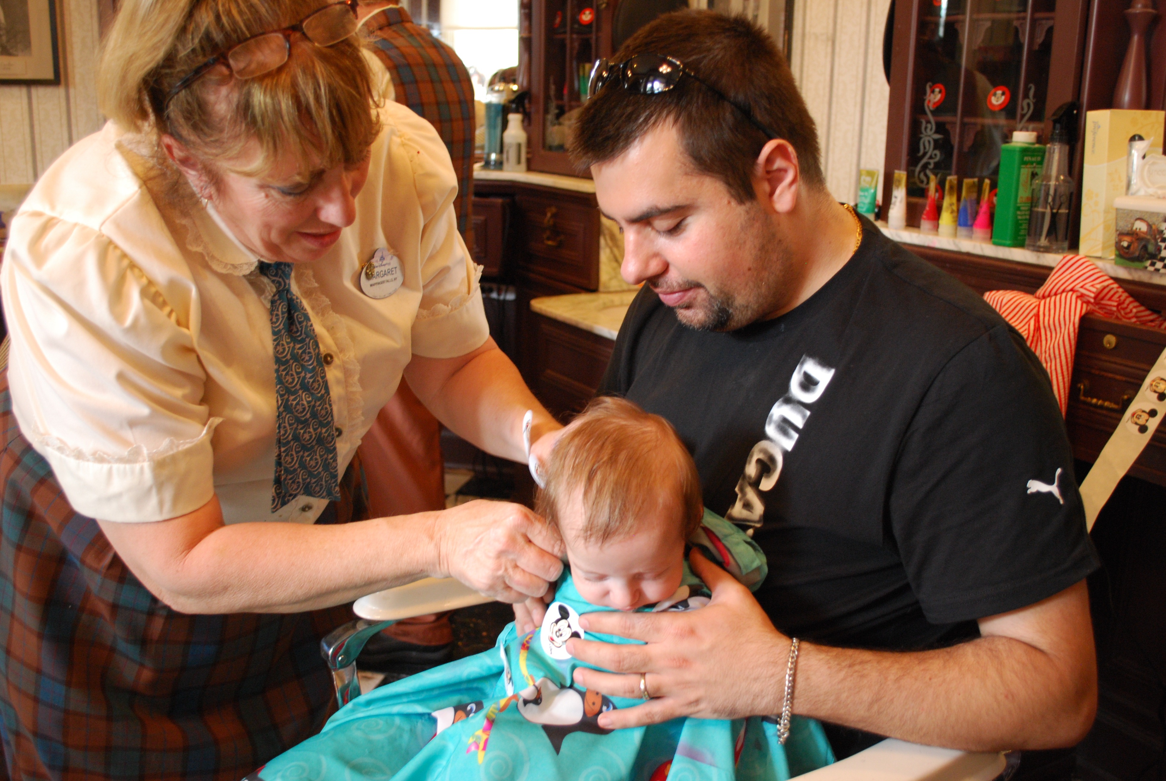 Any time a child gets a first hair cut it is a special experience. Babys first haircut at harmony barber shop magic kingdom. First haircuts are the harmony barber shops specialty and young magic kingdom guests who receive their first haircut here are treated to surprises from pixie dust and bubbles to mickey mouse stickers.