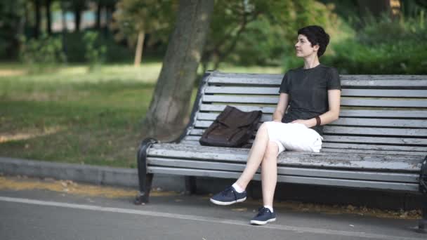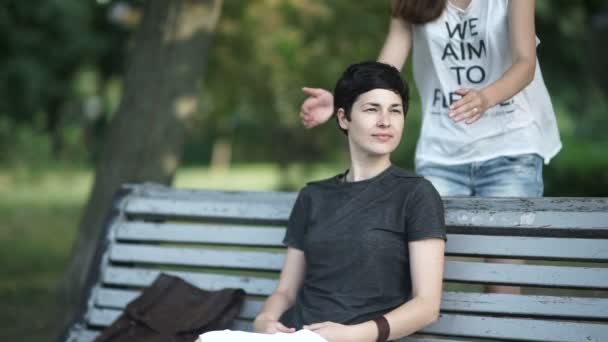 Video The Girl With Short Haircut Sitting On The Bench In The Green Park Cute Girl Make A Surprise To Her Girlfriend